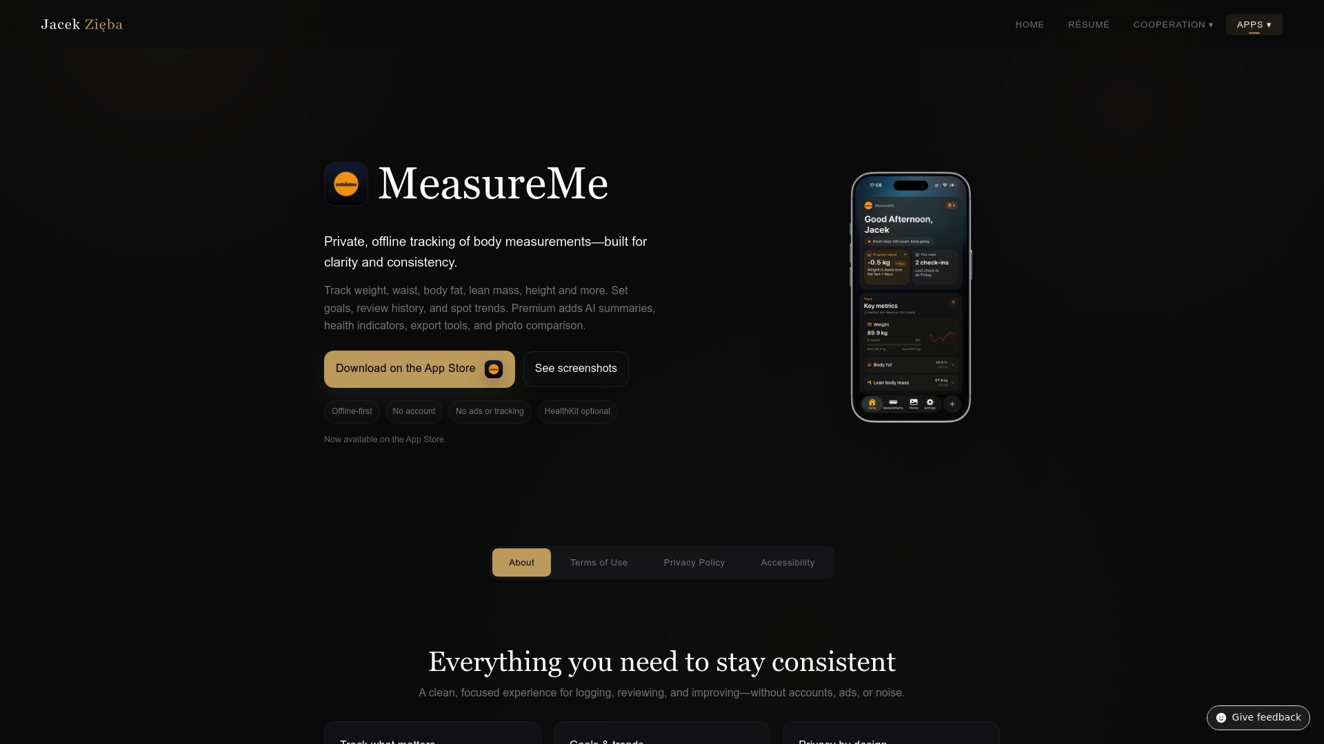 Visit the MeasureMe body measurement tracker to learn how offline tracking complements your fitness technology. Review the cookies policy for details on how the website protects your privacy.